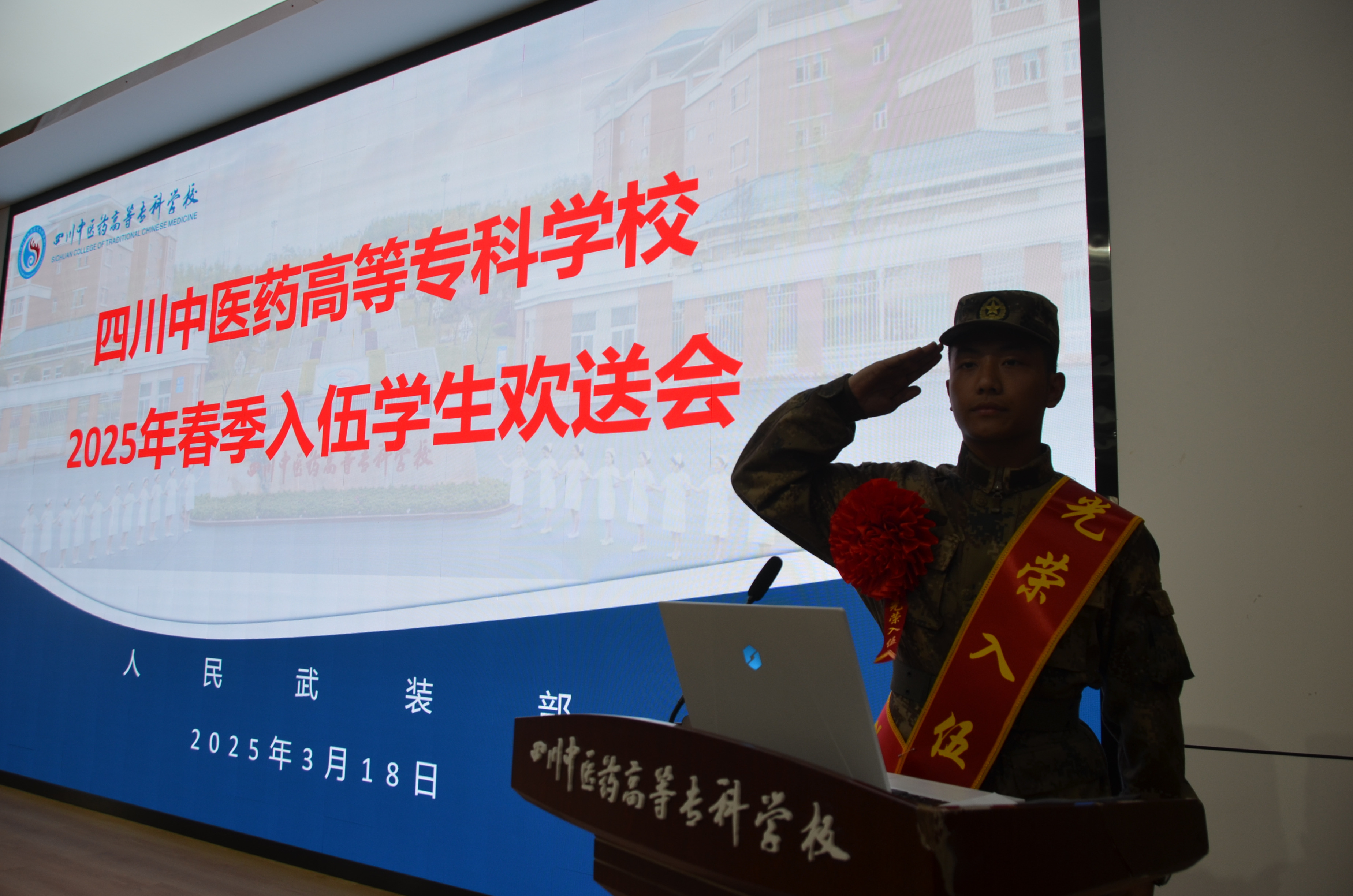 3月18日下午,我校在北区一教学术厅举行2025年春季入伍学生欢送会,为即将投身军旅的12名在校学子送行,其中我院独占8名,他们是2022级单招康复治疗技术专业吉布木加、吉如小哗惹、张兴国,2022级普专中医骨伤专业刘辛明、敬闻,2022级普专针灸推拿专业李佳宝、曹宸元、谭明宇。学院党总支副书记朱霜菊和辅导员盛琴琴、高洁老师参与此次欢送仪式。