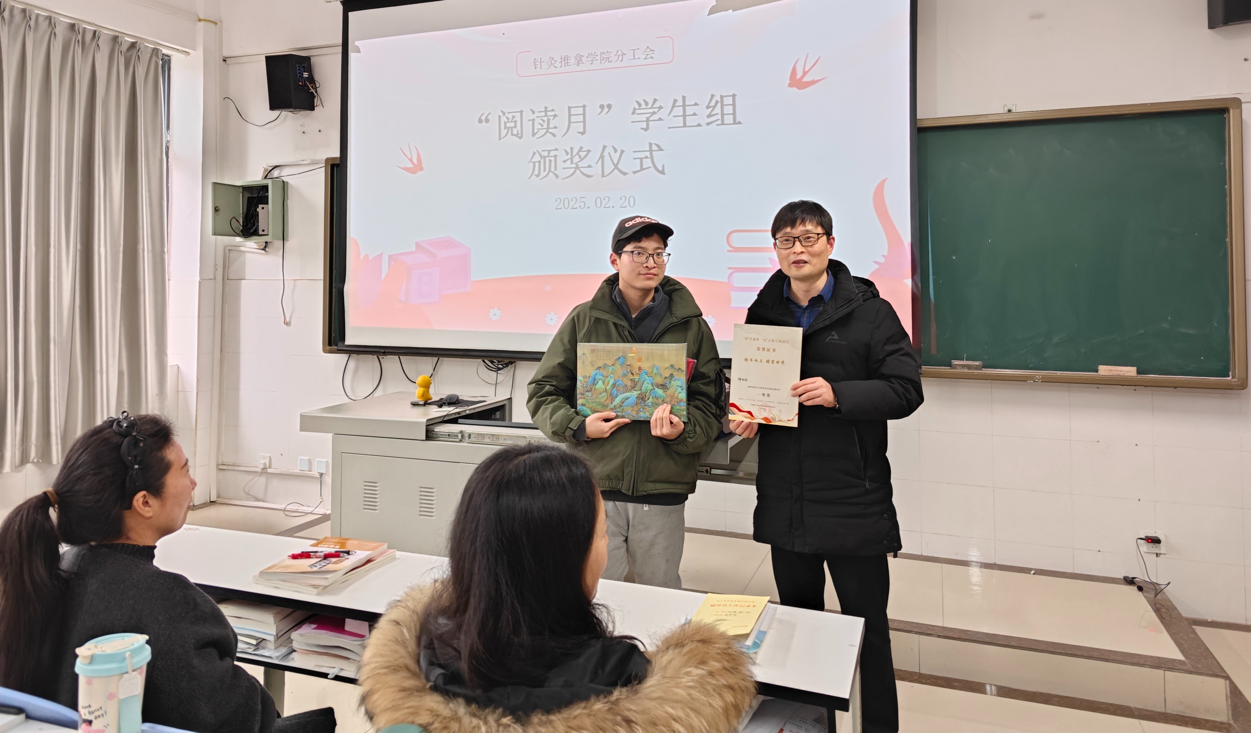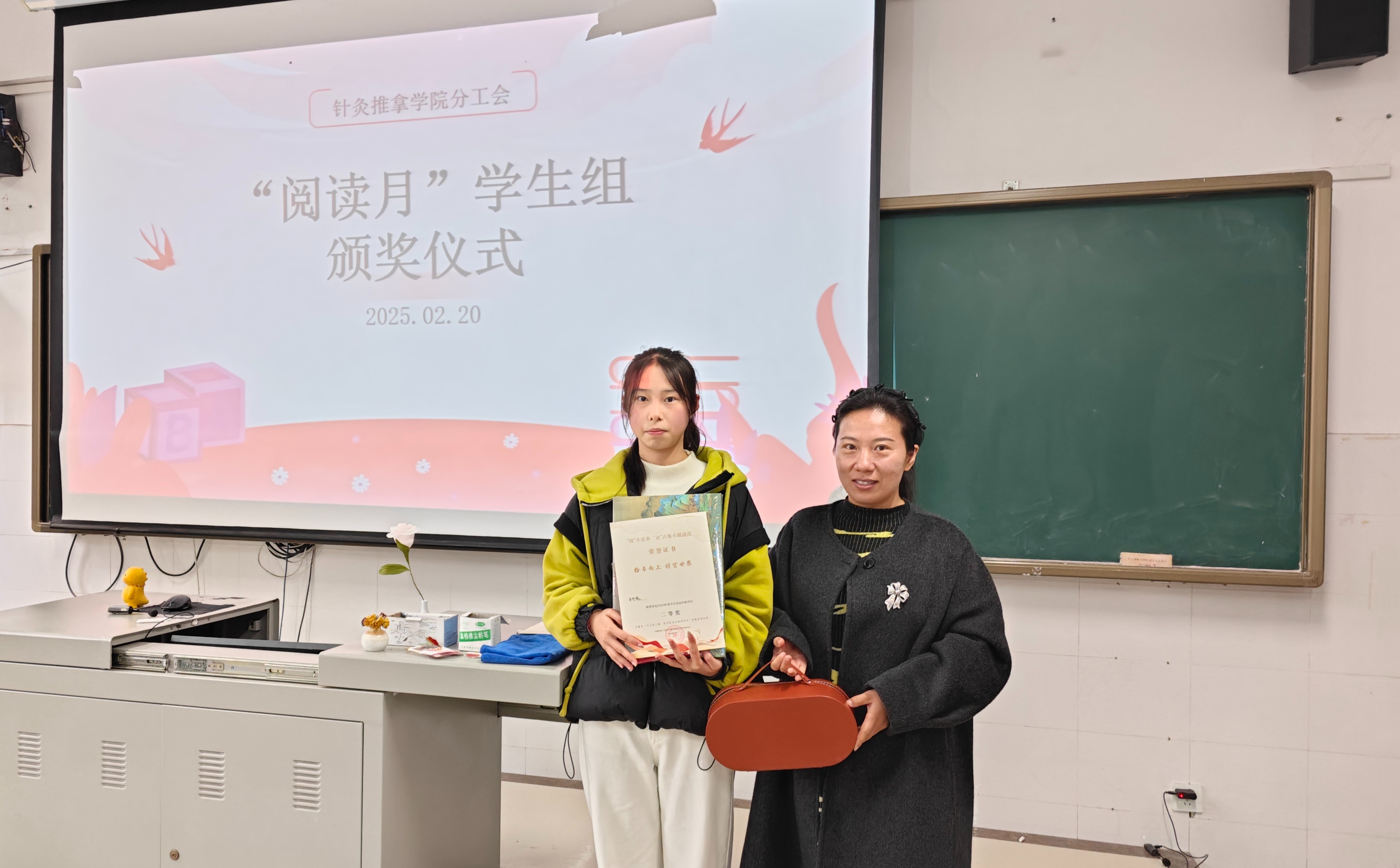 2月20日中午,针灸推拿学院分工会在南园6教203教室隆重举行了“阅”享盛世·“读”占鳌头线上阅读月学生组颁奖仪式。本次颁奖仪式由分工会委员梁莹主持,分工会主席熊华、分工会委员朱霜菊、梁莹及辅导员廖霞、钟好雪两位老师出席并为获奖学生颁奖。