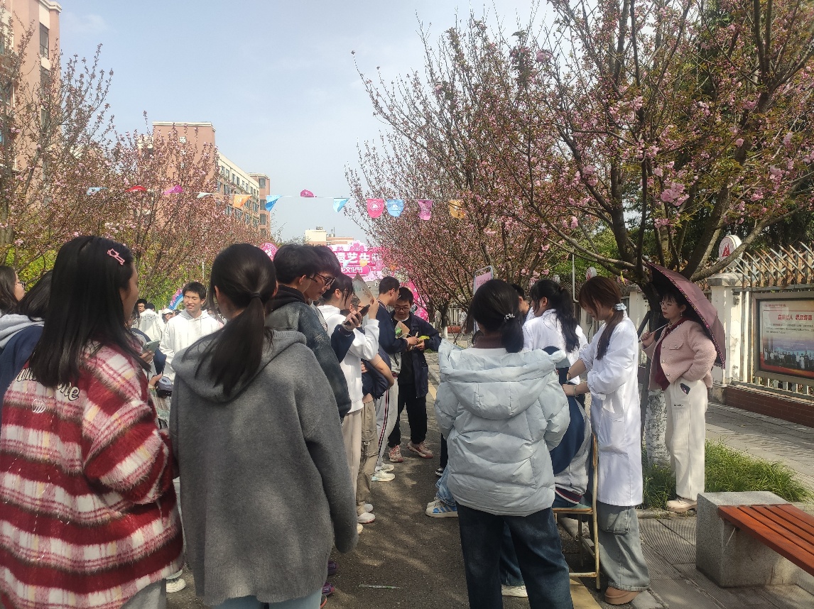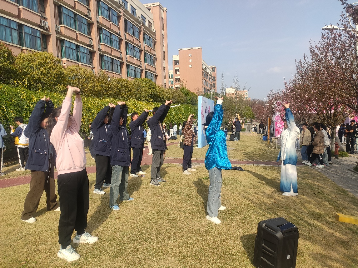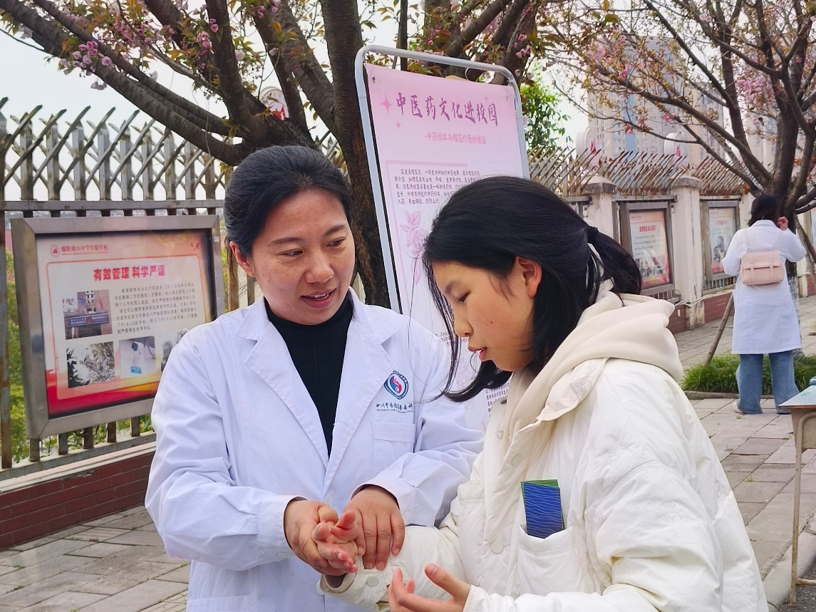 4月2日下午,绵阳南山中学实验学校迎来了2025年校园樱花文化节。我院周宏宇、朱霜菊、盛琴琴老师受邀参与此次活动,在一片浪漫的樱花盛景中,一场别开生面的中医药文化展示为校园带来了浓郁的传统文化气息。 在推拿手法体验环节,我院师生深入浅出地讲解和展示不同手法在养生保健中的功效,同学们积极踊跃排队,亲身体验推拿的奇妙感觉。体验结束后,老师教会同学们识别太阳、合谷、内关、足三里等常见穴位,并介绍每个穴位对应的保健作用,引导同学们在日常生活中通过穴位按摩,达到预防疾病、强身健体的效果。  八段锦展示环节,我院师生展开传统功法八段锦的动作分解教学,动作舒展优美,一招一式尽显传统功法的精髓。现场不少同学被八段锦独特的魅力所吸引,跟着口令一起练习,感受传统养生文化的魅力。