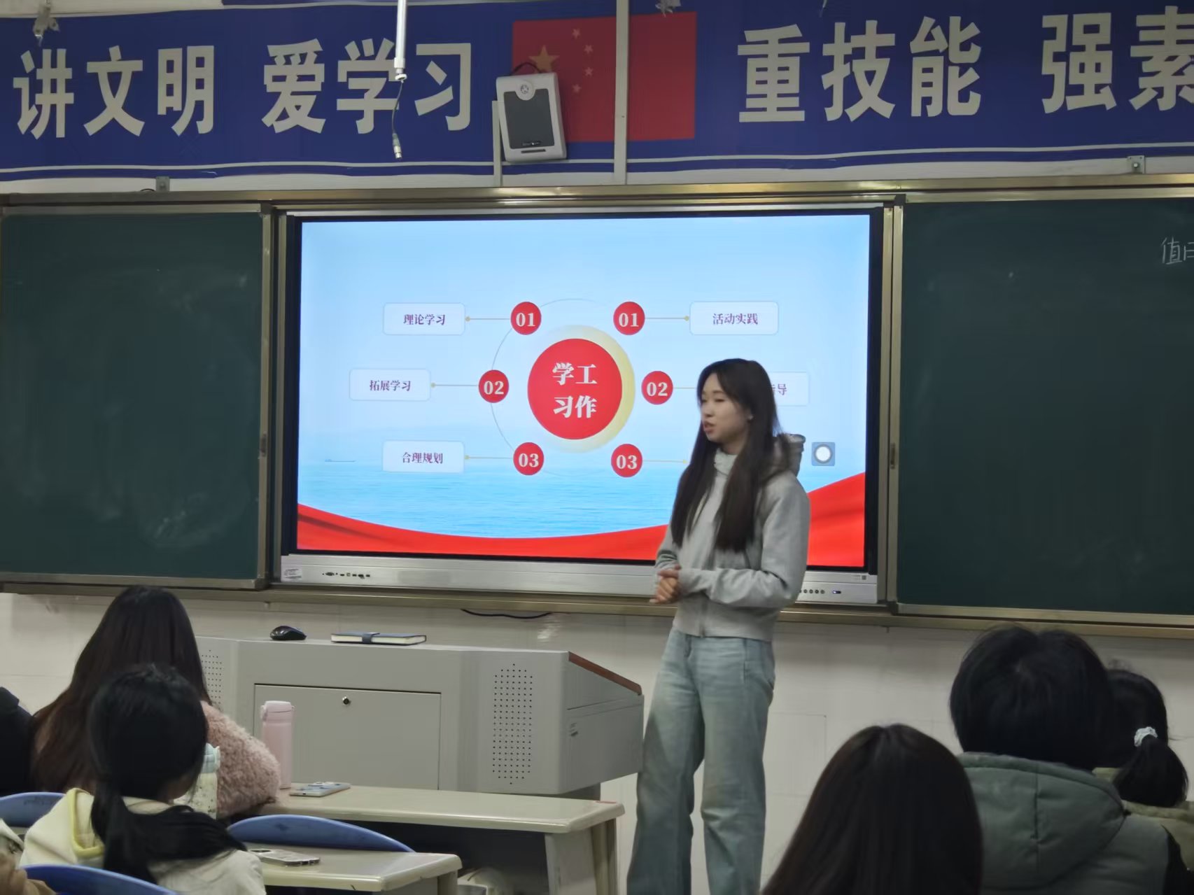 分享会上,张如意同学以“行一段路、聚一段缘、做一件事、尽一份心”为主题,从学习、工作、生活等多个角度,生动讲述了自己在大学期间的奋斗历程。她结合自身经历,强调了目标规划与时间管理的重要性,并分享了如何在学业、工作和社会实践中取得平衡的经验。她提到:“大学是探索与成长的舞台,每一段经历都是宝贵的财富。只有脚踏实地、心怀热爱,才能不负青春韶华。”
