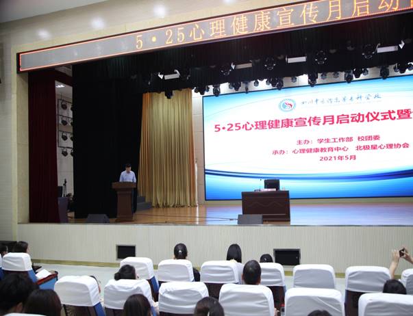在5·25大学生心理健康节即将到来之际,5月17日,由学生工作部、校团委主办,心理健康教育中心、北极星心理协会承办的5•25心理健康宣传月启动仪式暨专家讲座在北区学术厅成功举行。学校党委委员、副书记汪涌泉,川北医学院精神卫生学院院长黄国平教授,各学院党总支负责同志及辅导员和学生代表300余人参加活动。