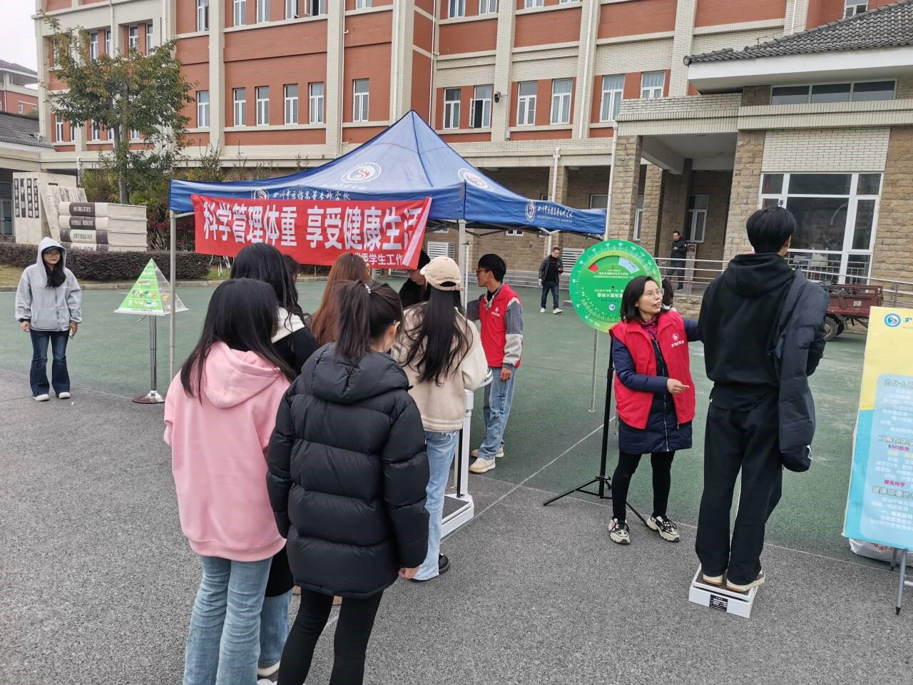 在互动活动区域,工作人员为师生们测量身高、体重,讲解如何计算体重指数,并向师生发放精心设计的体重管理监测卡,卡片上根据科学标准给出了合理的体重范围以及体重管理建议,帮助同学们更好地了解自己的身体状况,为后续的体重管理提供参考依据。