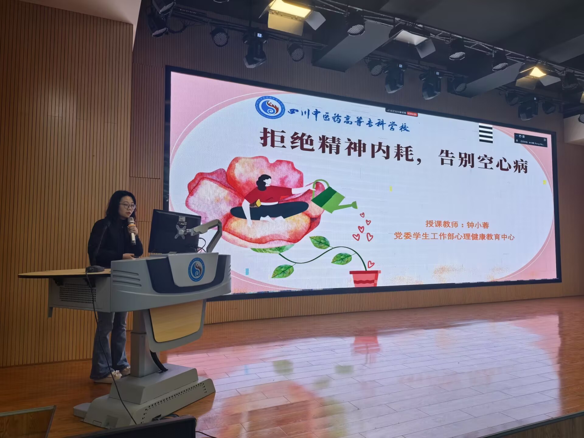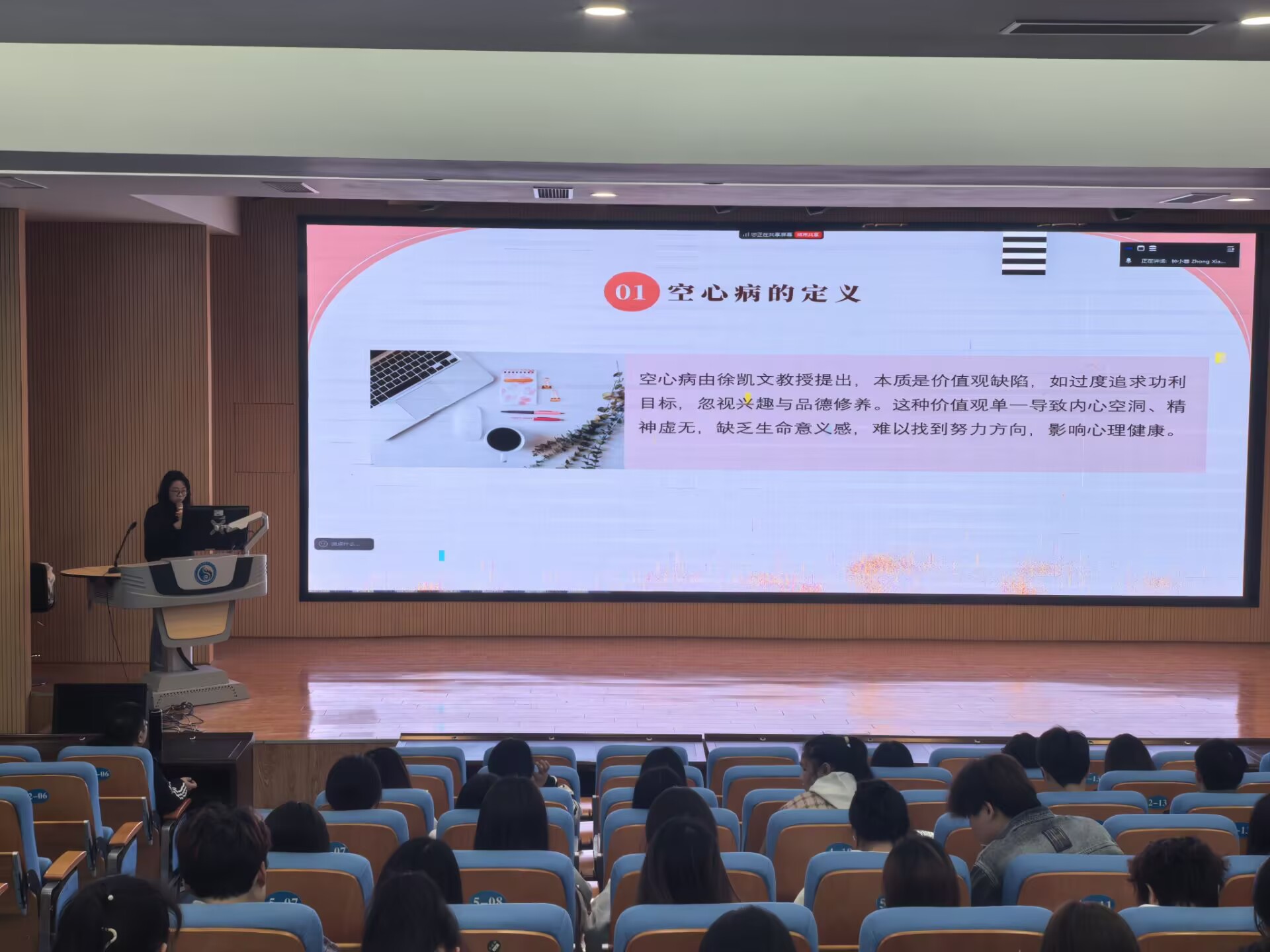 为普及心理健康知识,提升青年学生心理调适能力,3月24日至25日,党委学生工作部分别在西园明真楼学术厅和北园岐伯楼学术厅开展了学生成长发展心理健康讲座。心理健康教育中心专职教师钟小蓉以“拒绝精神内耗 告别空心病”为主题,通过线上线下相结合的形式为400余名同学提供了心理调适指导。
