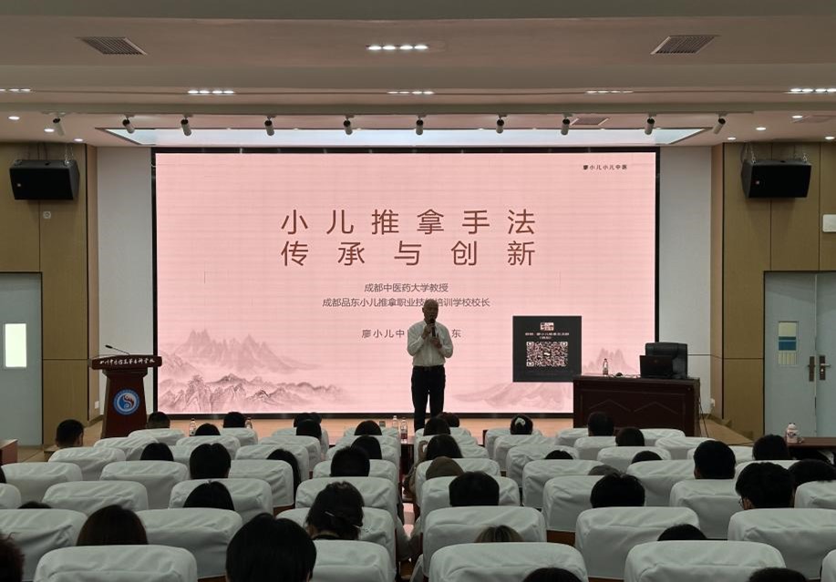 岐伯楼学术报告厅座无虚席,学术氛围浓厚。廖品东教授以《小儿推拿手法传承与创新》为主题,从小儿推拿手法源流、手法属性、创新与发展、特色手法等四个维度展开讲解,系统梳理了小儿推拿从《内经》奠基到葛洪、孙思邈等医家发展的历史脉络,强调手法需“符合儿童生理病理规律、中医理论、生物力学及美学原理”的四大创新原则,并现场演示了“双点门”“抱肚法”“水底捞明月”等特色手法的操作技巧。廖教授提出“有效、艺术、情结、自护”的临床理念,指出“手随心转,法从手出”是推拿精髓,其生动讲解配合手法示范,令在场师生直观感受到传统医学的独特魅力。