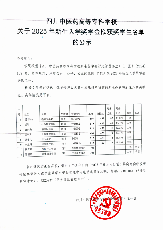 四川中医药高等专科学校关于2025年新生入学奖学金拟获奖学生名单的公示
