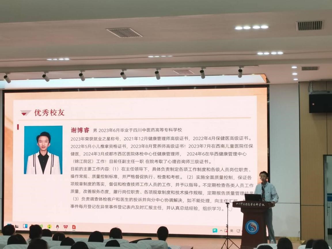 校友们倾情分享了他们的职业成长故事。2023 届毕业生谢博睿从儿童医院保健医一路成长为健康管理中心管理者,他提出 “技能证书 + 跨界思维” 的进阶策略,着重强调健康管理师、心理咨询师等资质对于职业转型所发挥的关键作用。同为 2023 届的高职护理班学生张佳琳,选择扎根绵阳康养中心,她以 “一碗热粥的温度” 守护失能老人,呼吁学弟学妹们在基层服务过程中锤炼共情力与责任感。而曾荣获全国技能大赛冠军的急诊科护士春敏芳芳,则分享了她在 “急诊室里的生死时速” 中的惊险经历,并展示了养老护理技术创新案例,生动印证了专业精进是护理人员的核心竞争力。分享结束后,学院为三位校友颁发了 “护理学院校友贡献感谢证书”,以此表达对他们在行业以及母校发展方面持续贡献的崇高敬意。