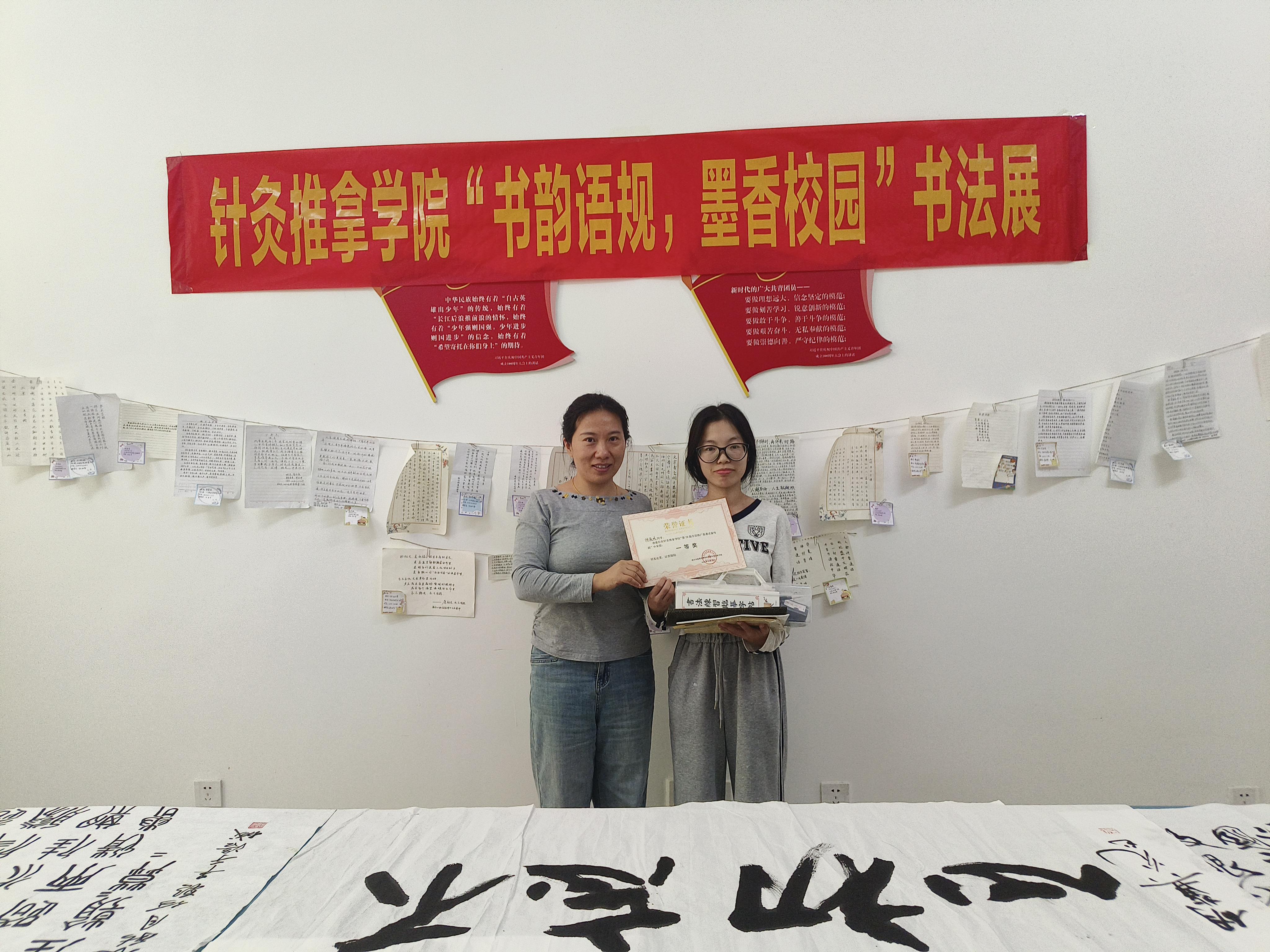 为传承中华优秀传统文化,彰显汉字书法独特魅力,近日,针灸推拿学院“书韵语规,墨香校园”书法展顺利举办,并于9月23日在学院学生公寓党团活动室举行颁奖仪式,为历时一周的赛事画上圆满句号。