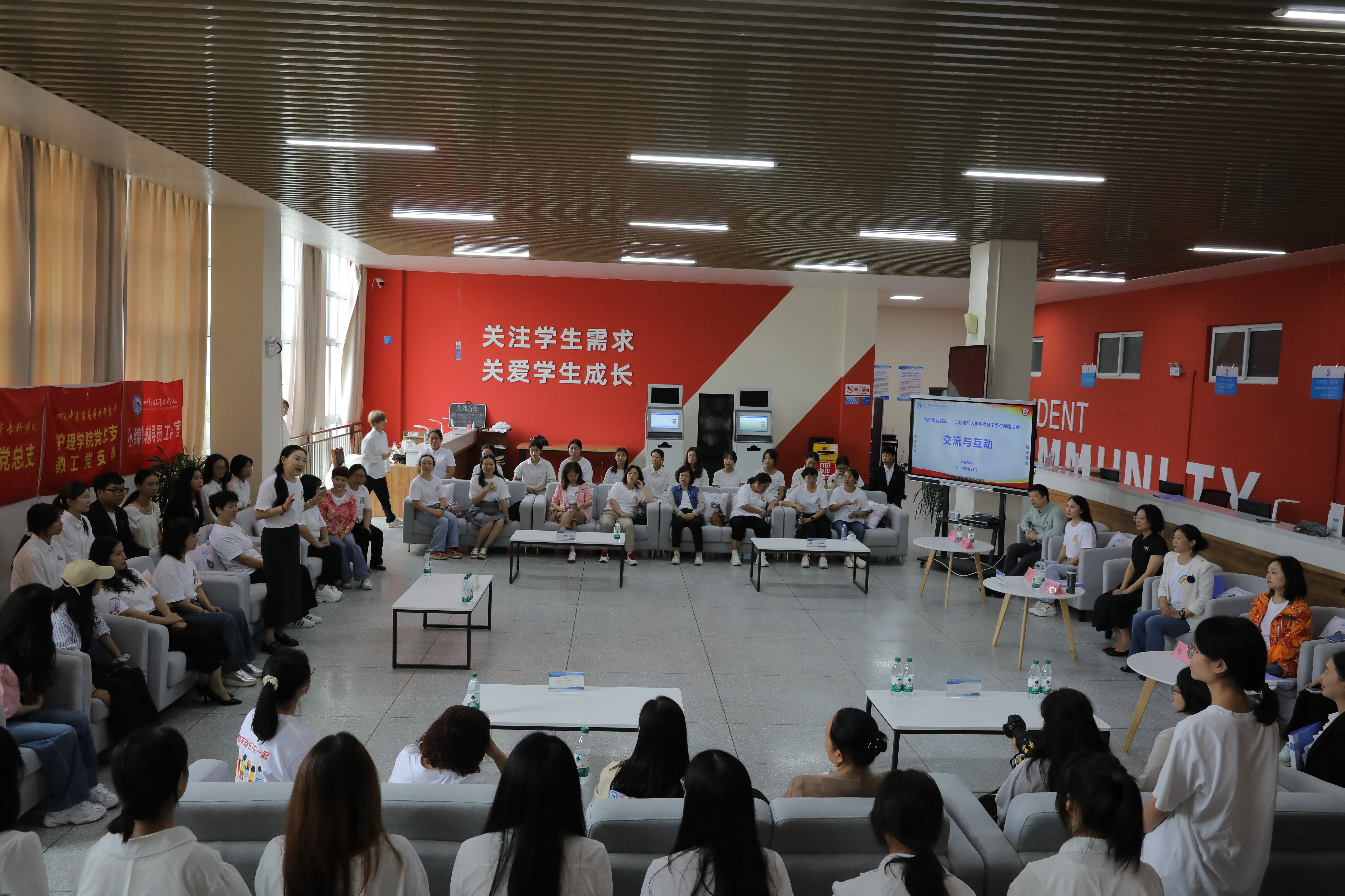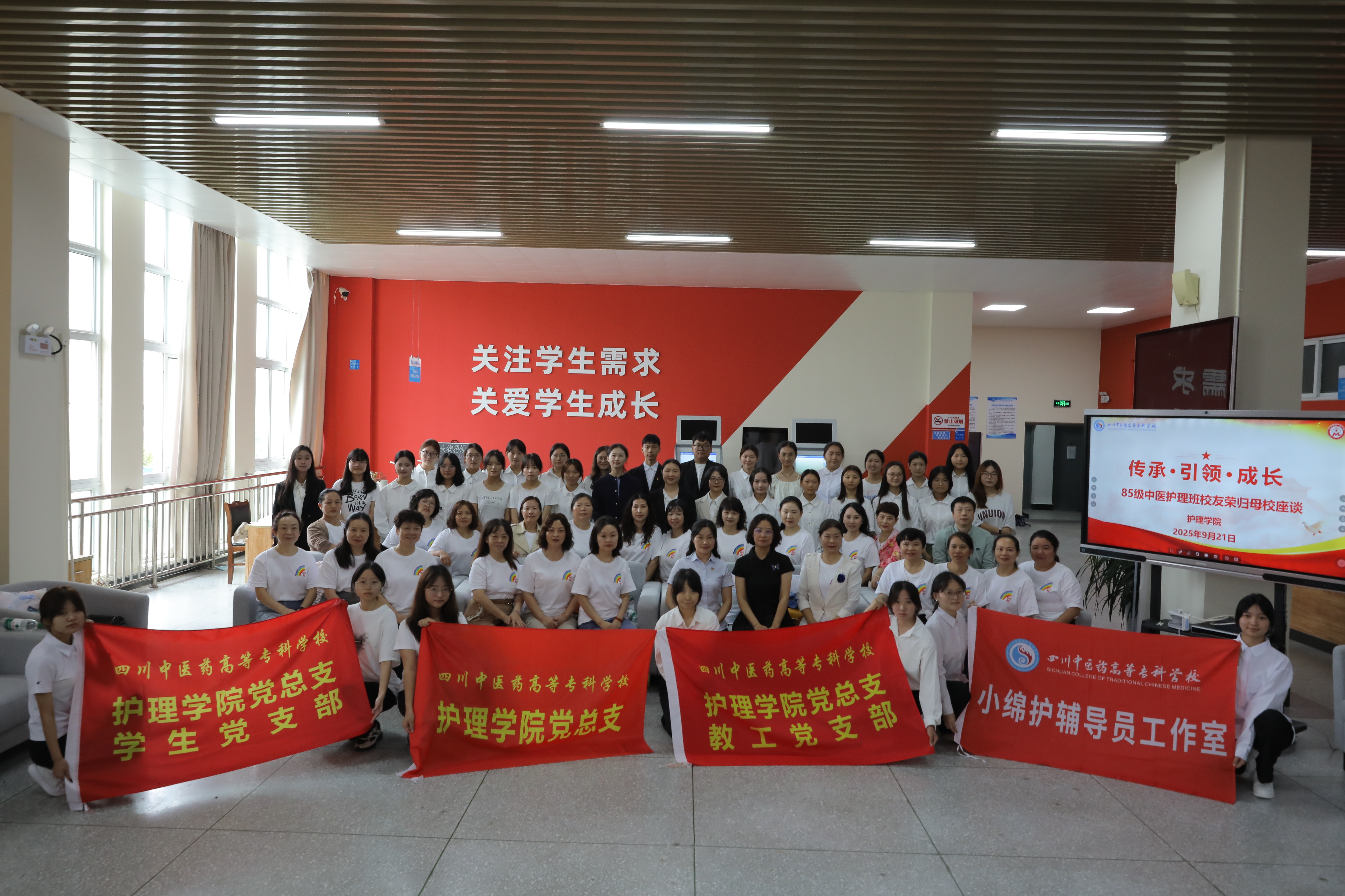 2025年9月21日,学校北园学生事务大厅内座无虚席,一场以“传承红色基因,弘扬中医护理”为主题的座谈会在此温情启幕。荣归母校的85级中医护理班校友代表与“00后”学子齐聚一堂,用一场跨越40年的面对面对话,串联起两代护理人的青春与使命,让护理的职业精神在交流中代代相传。