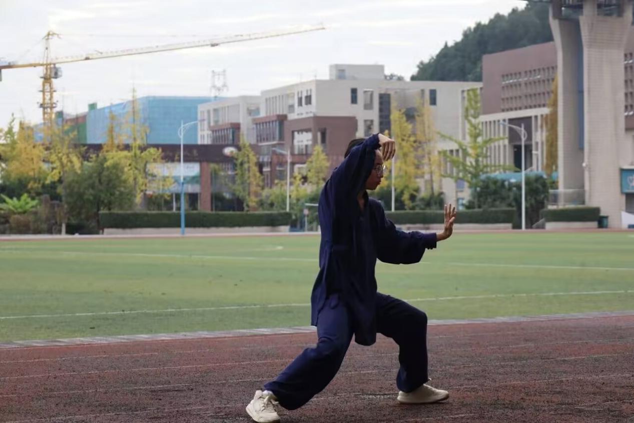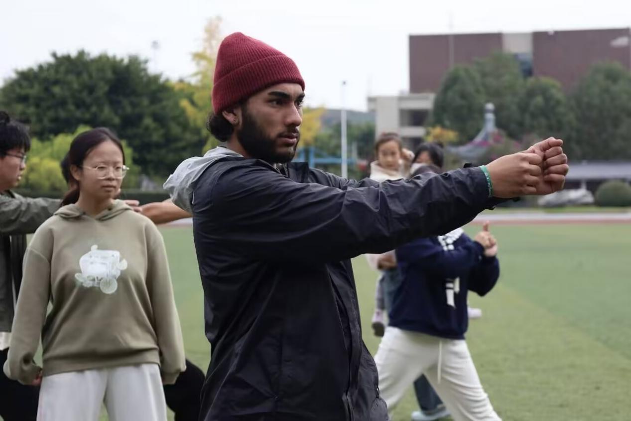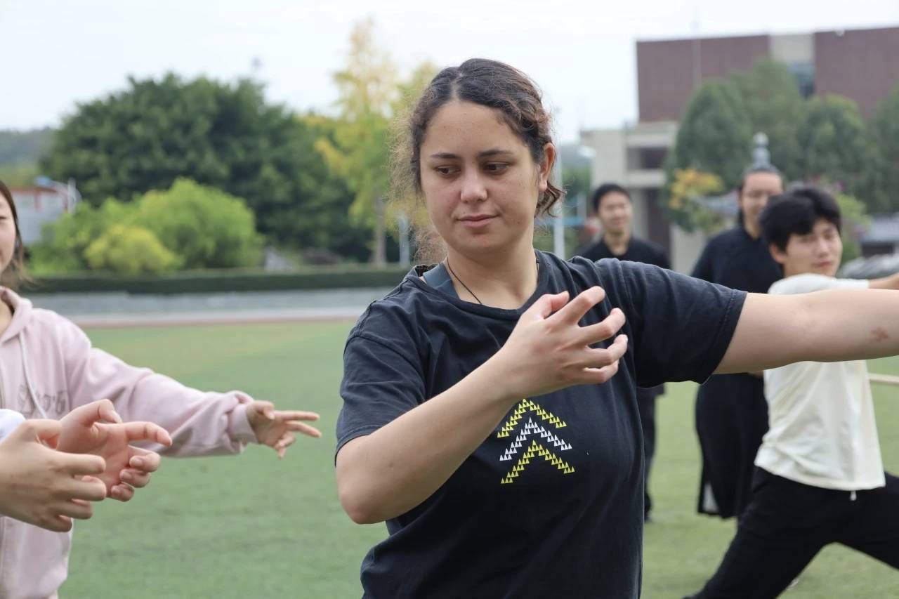 紧接着,武术社成员带来行云流水般的太极拳表演。起势、野马分鬃、白鹤亮翅……一招一式如云卷云舒,气韵沉静,身形从容。他们用身体书写中国哲学——不疾不徐,不矜不伐,却蕴含无穷力量。交流生们不禁赞叹“So good and interesting”,也为后续的深入交流点燃热情。